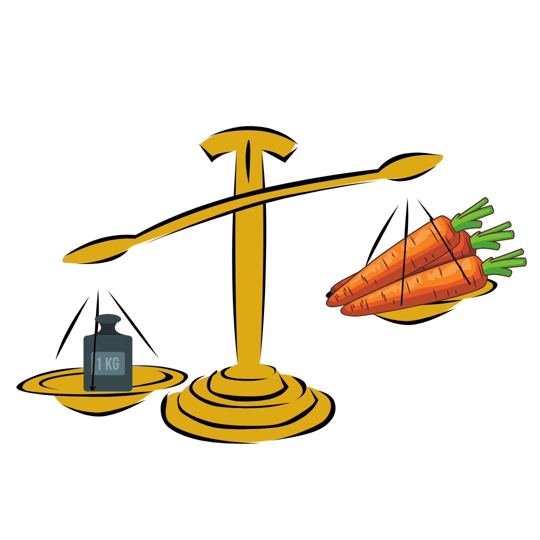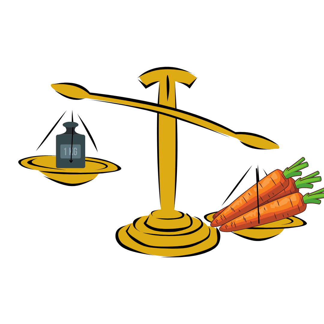Not knowing how many carrots you need to make 1 kg, you begin placing carrots on the high end of the scale one at a time. 1 carrot, nothing moves 2 carrots, nothing 3, still nothing You keep placing carrots, 11, 12, 13… and there is still no shift in balance! You begin to wonder if maybe the scale is broken. You must be getting really close to 1 kg, surely.